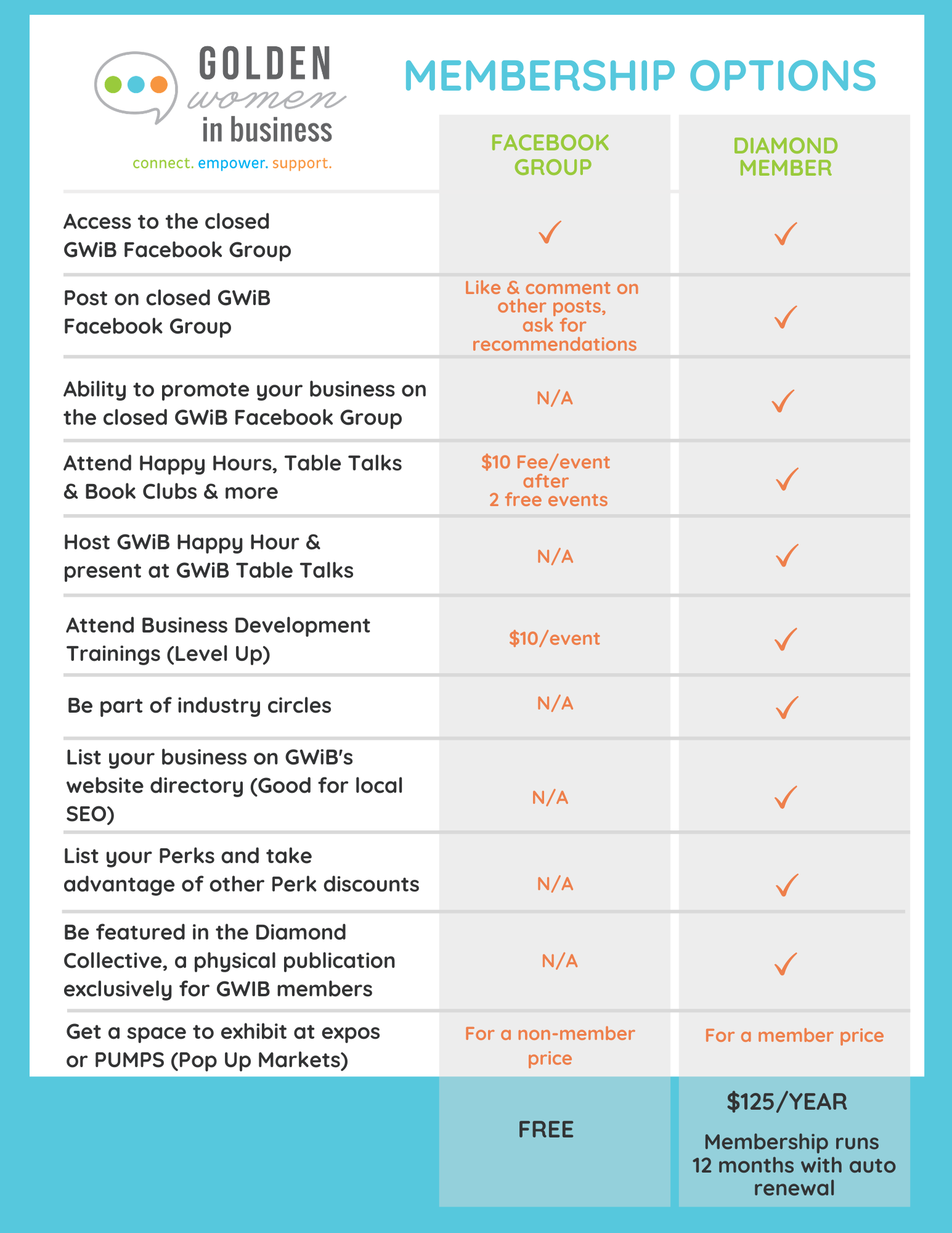 >>> YOU NEED TO LIVE OR WORK IN GOLDEN, CO TO BE ELIGIBLE FOR GWIB DIAMOND MEMBERSHIP. We will ask you for a verifiable address. <<<